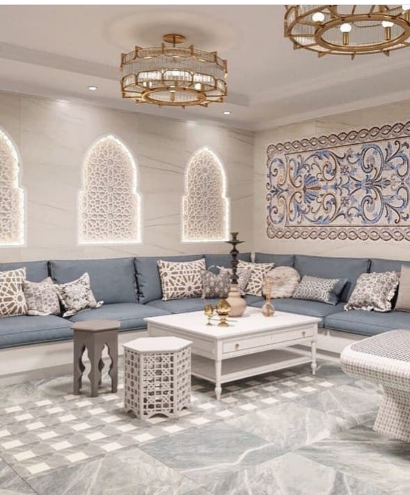 مجلس عربي فاخر يجمع بين الأصالة والفخامة، بتصميم أنيق يجسد روح الضيافة العربية. يتميز بأرائك مريحة مكسوة بالأقمشة الفاخرة وألوان دافئة تضيف إحساسًا بالترحاب والسكينة. الجدران مزينة بالحجر الطبيعي والإضاءة الجانبية الناعمة التي تعزز من الأجواء الفخمة. هذا المجلس مثالي لاستقبال الضيوف وقضاء أوقات ممتعة في جو من الأناقة والرفاهية.